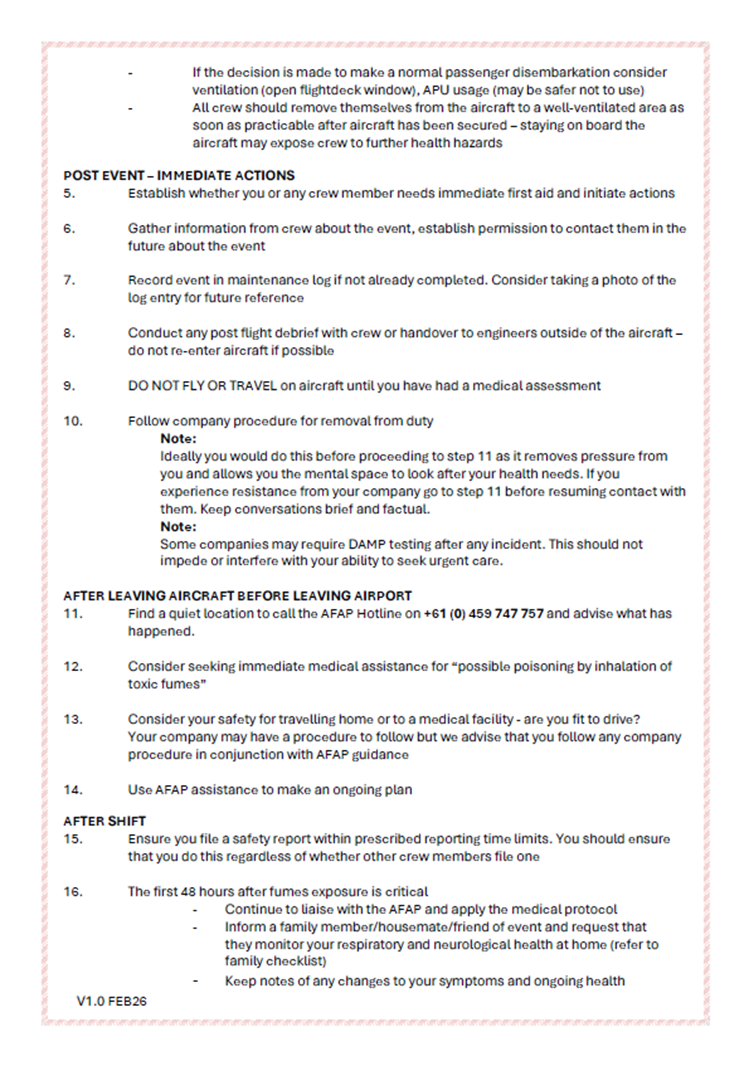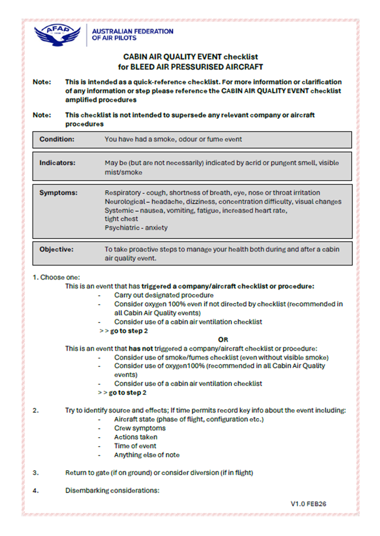The AFAP has been developing a Cabin Air event checklist for members to assist in taking important steps if they have a cabin air event. The concept is for member pilots to carry the checklist in their flight bag. AFAP staff have also had training to support a member to ensure the important first steps are taken to protect their own health. The checklist will be distributed to members. See Appendix 1 below.
